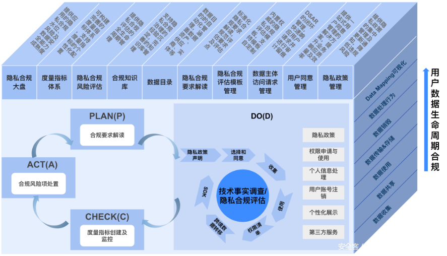 它不仅包括全球隐私合规规则的解读和遵从、底层数据发现、隐私影响评估流程支持以及合规项目生命周期管理等;还内置多项自动化发现能力,及时发现敏感的个人信息及信息流转,并对这些数据进行分类分级,依据内置的合规分析引擎完成隐私合规的自动化检测及冲突校验;提供隐私合规治理工作的PDCA闭环管理。