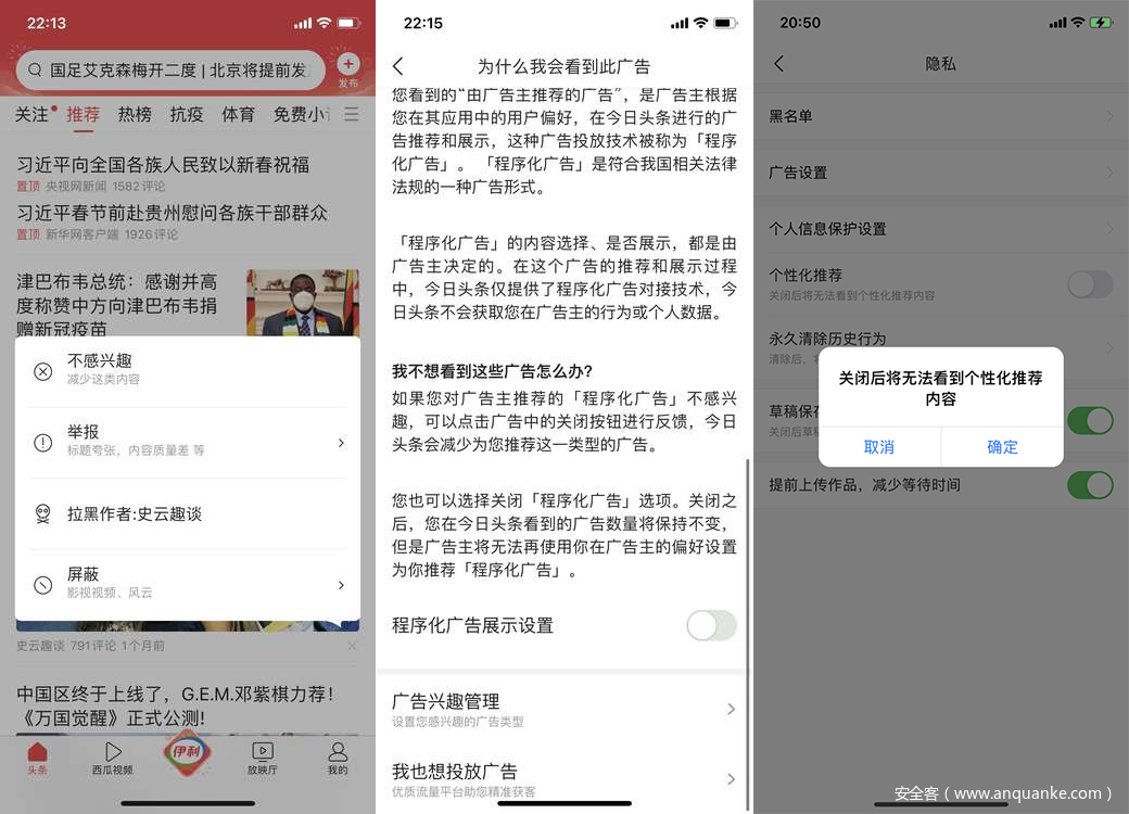 我们在今日头条所尝试的隐私保护探索,是公司这一理念的缩影,为了保障用户接收信息的全面性、客观性、透明性以及自主性,持续建设与迭代程序化广告退出控制机制、用户画像标签自主编辑机制、及个性化推荐退出等相关功能,以充分响应用户权益。