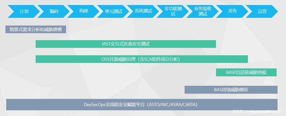 在DevSecOps体系下,建设安全开发体系或者敏捷安全体系,是分步骤、分阶段的,企业要结合自身情况,考虑一期二期三期分别做什么。这里给一个简单的参考:一期实现上线前的自动化安全风险诊断;在二期的时候,基于一期的成果,先治理再打通流程;在三期的时候,形成敏捷右移。一句话总结就是“安全体系的左移和敏捷的右移”,但是还是需要结合自身不同的场景做一些针对性的设计。
