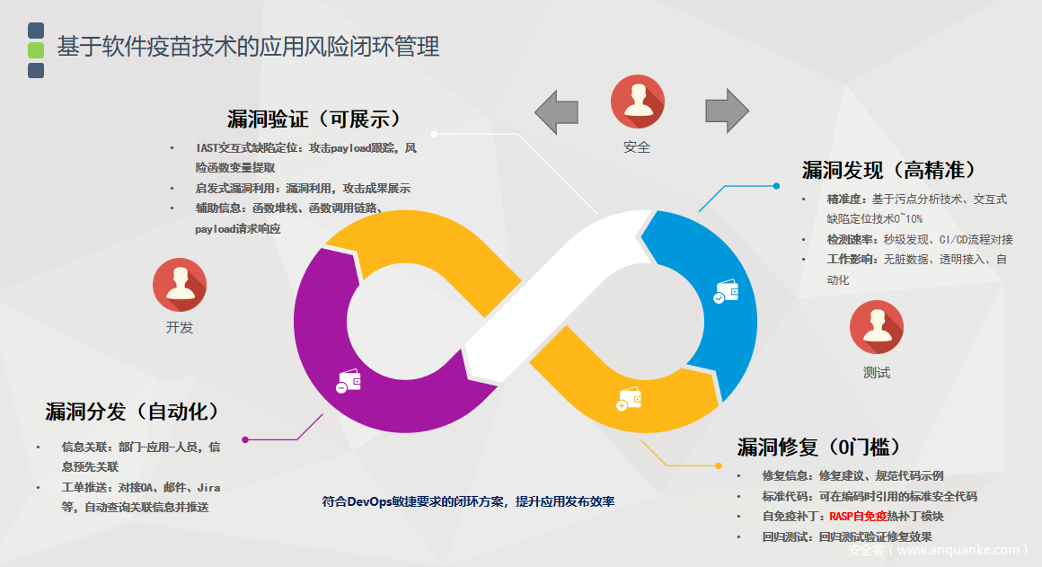 这里面有两层含义:第一个是需要开发的应用都会经历相对完善的软件开发体系和流程;第二个是应用本身会应用代码疫苗技术,让它实现对风险的自发现和对威胁的自免疫。
