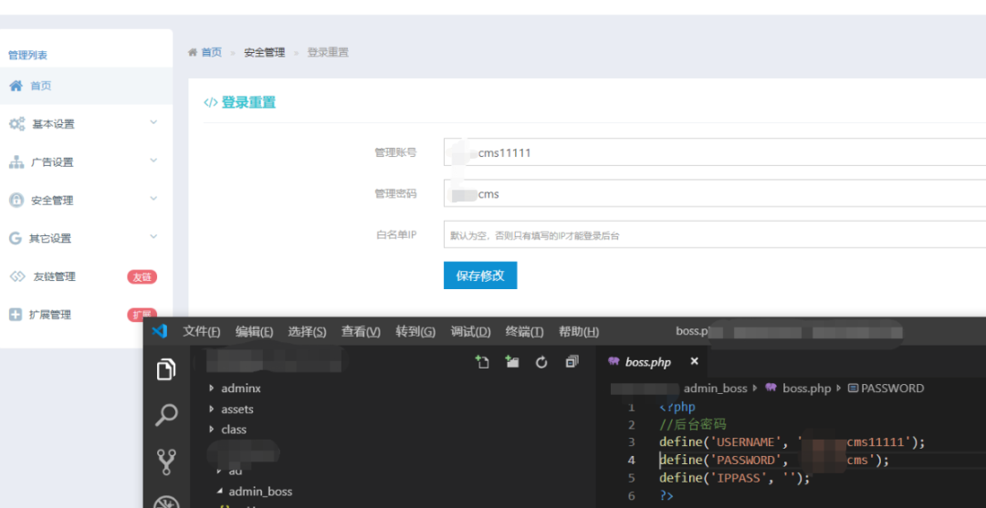 在本地测试发现,修改密码处内容是直接写到boss.php文件,并且没有过滤: