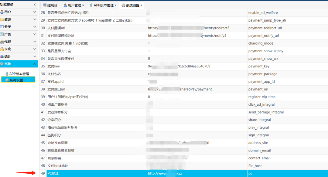 就在一筹莫展的时候,上帝为我开了一扇窗。翻后台功能,发现系统配置处配置了几个域名。叫PC的这个域名引起了我的注意。