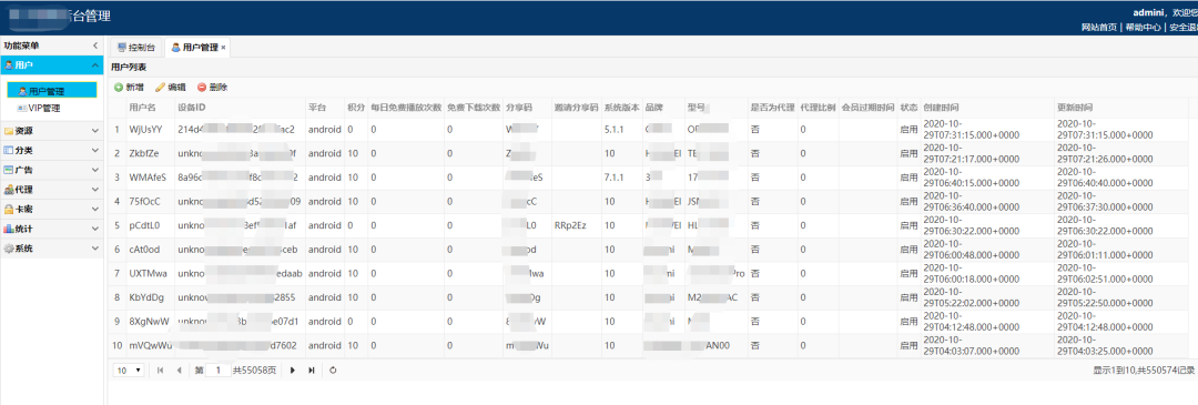 通过后台可以看出这个数据应该是APP注册数据,有50多万条记录。用户名应该是随机取名的,后来拿下权限后验证猜测没错:
