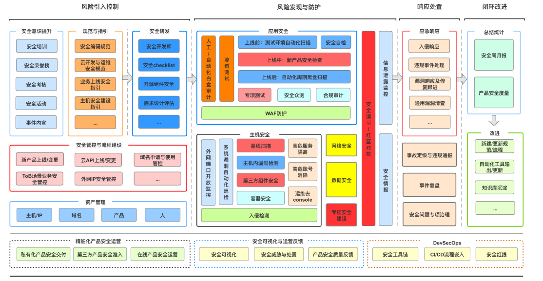 下图是我们基于风险引入流程梳理的体系图,分为风险引入、风险发现与防护、响应处置和闭环改进四个维度,基本涵盖了产品安全各个维度能进行的活动。