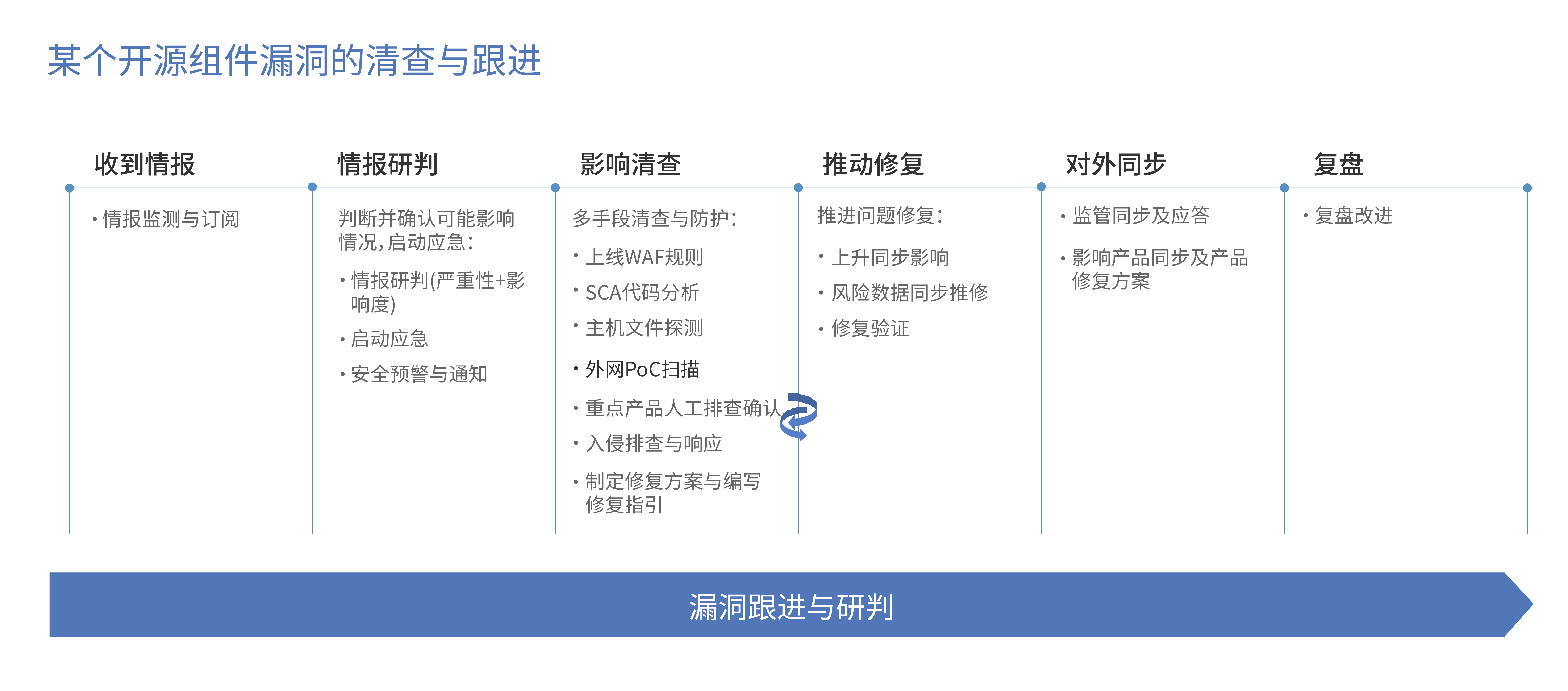 在基于情报的风险清查方面,我们基本上是采用这样一个机制:从监测、分析、资产匹配、影响面输出到推动修复。这里还涉及资产测绘的能力建设,因为一旦一个漏洞爆发,再去探测其实有点晚了,所以需要提前做好资产测绘,这样可以很快地匹配出影响面。
