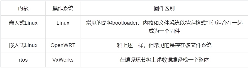 如常见的基于嵌入式Linux内核的设备,是将bootloader、内核和文件系统(可能会存在多种文件系统,如基于嵌入式Linux内核的OpenWRT系统的设备)以特定格式打包组合在一起成为一个固件,进行解包后,会是几块独立的文件数据;而像RTOS类型的设备,它的固件则是在编译环节就将上述内容融合在了一起成为一个整体的文件,后续所有数据的使用都需要通过偏移来寻找。