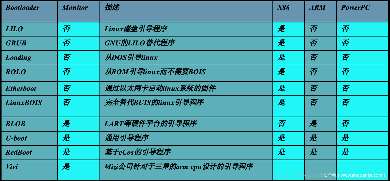 但大部分bootloader仍然具有很多共性,某些bootloader也能够支持多种体系结构的嵌入式系统。例如,U-Boot就同时支持PowerPC、ARM、MIPS和X86等体系结构,支持的板子有上百种。下图展示了常见的bootloader的基本信息和对不同架构体系的支持情况。