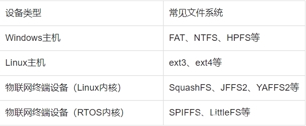 文件系统是操作系统用于明确存储设备或分区上的文件的方法和数据结构,像Windows操作系统常用的文件系统有FAT、NTFS、HPFS等,Linux操作系统常用的文件系统有ext3、ext4等。对于物联网终端设备,其硬件资源在存储能力以及内存等方面有诸多限制,所以常见的一般都是压缩文件系统,如基于Linux内核操作系统的文件系统有SquashFS、JFFS2、YAFFS2等,基于rtos的实时操作系统常见的文件系统有SPIFFS和LittleFS。