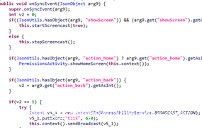 还会不停的监控页面打开情况,如果用户拖动木马图标打开应用设置页面或者打开木马的卸载对话框,该木马会自动关闭该页面防止被修改或者被卸载;木马还会自动将自己添加到设备管理器防止卸载,自动关闭取消设备管理器权限的页面并返回Home页面;自动关闭取消无障碍服务的页面并返回Home页面。
