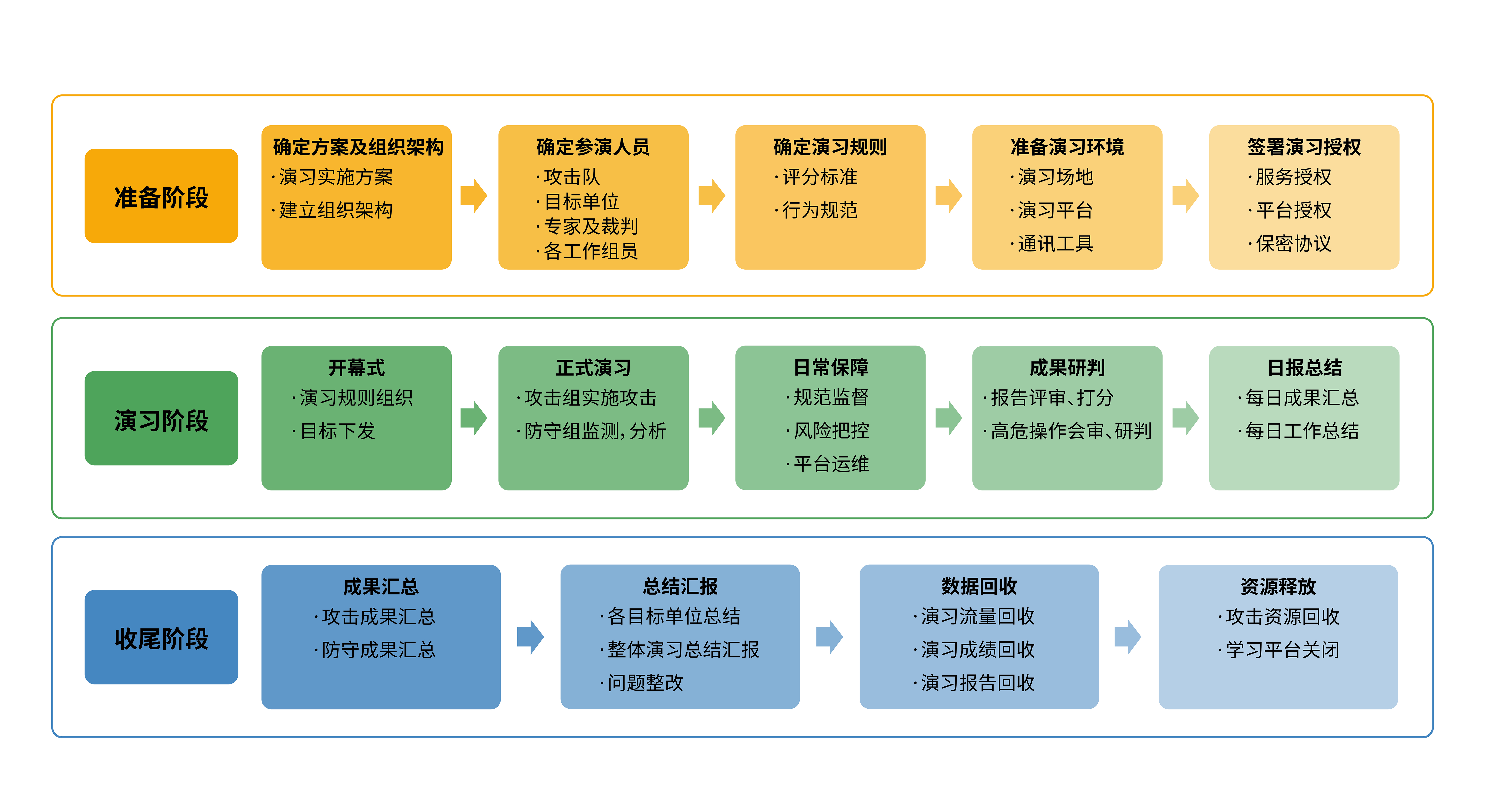 那么从防守方的角度来看,在网络安全攻防演练中应该采取哪些措施提升安全防护水平呢?一般来说,防守工作分为三大阶段:准备阶段、实战阶段、收尾阶段。本文将要讨论的就是对攻防演练结果至关重要的的事前准备阶段。