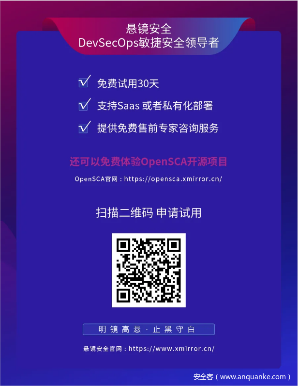 悬镜安全,由北京大学网络安全技术研究团队“XMIRROR”于2014年创立。作为业界DevSecOps敏捷安全领导者,悬镜专注于以代码疫苗和积极防御技术为核心的DevSecOps软件供应链持续威胁一体化检测防御,结合多年的敏捷安全落地实践经验和软件供应链安全研究成果,探索出基于原创专利级“敏捷流程平台+关键技术工具链+组件化软件供应链安全服务”的第三代DevSecOps智适应威胁管理体系。该体系主要涵盖从威胁建模、开源治理、风险发现、威胁模拟到检测响应等关键环节的开发运营一体化敏捷安全产品及以实战攻防对抗为特色的软件供应链安全服务,覆盖DevSecOps、软件供应链安全、云原生安全等关键应用场景,作为新一代敏捷安全框架,已成功帮助金融电商、泛互联网、车联网、电信运营商、能源电力等行业上千家企业构筑起一套适应自身业务弹性发展、面向敏捷业务交付并引领未来架构演进的内生积极防御体系。更多信息请访问悬镜安全官网:www.xmirror.cn