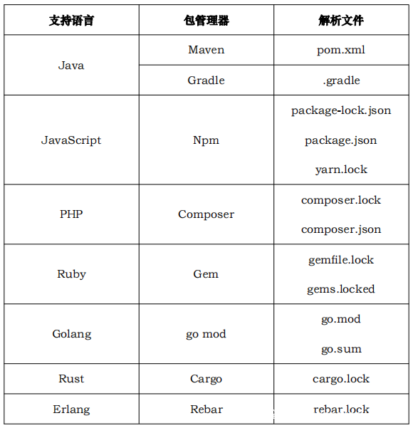 现已支持以下编程语言对应的包管理器及相关配置文件的解析:
