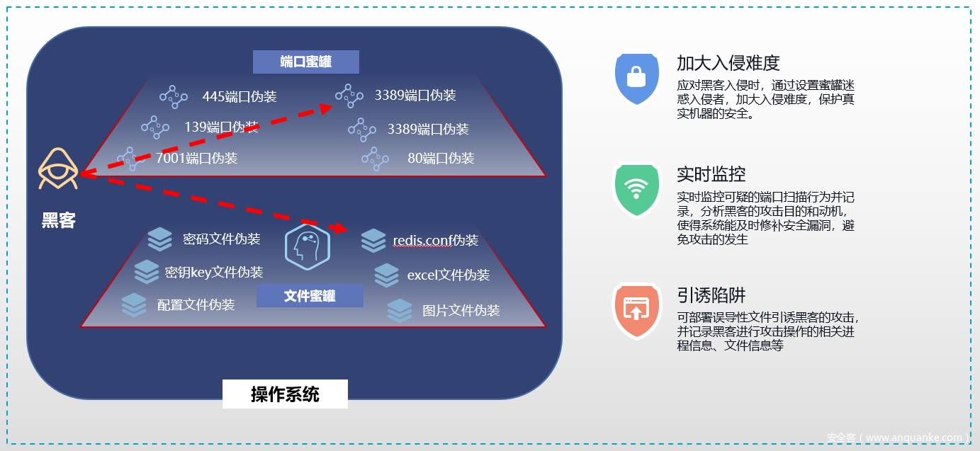 主机型蜜罐:主机型蜜罐通过布置诱饵主机、网络服务或者文件,诱使攻击方对诱饵进行攻击,从而对攻击行为进行捕获和分析,了解攻击方所使用的工具与方法,推测攻击意图和动机。