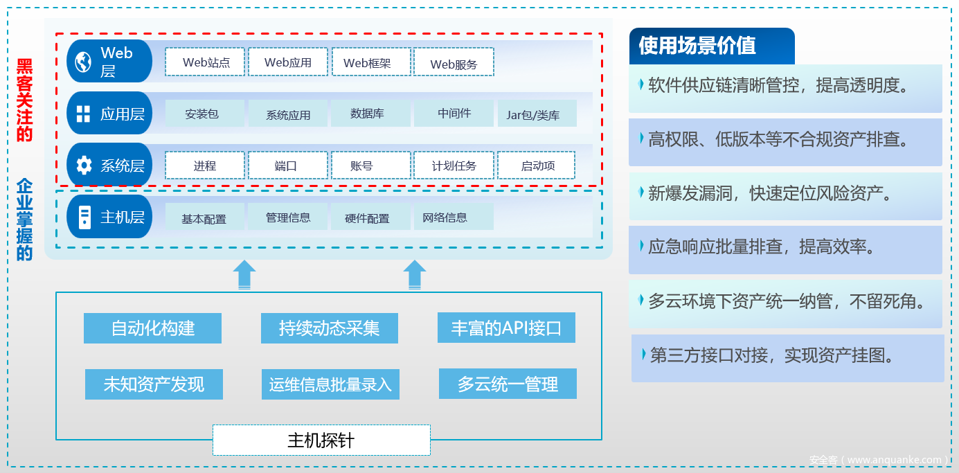 资产清点:你保护不了你看不到的资产。所有威胁和脆弱性的运营都需要依赖资产展开。为进一步提高大规模集群主机的管理效率,需提高自动化程度,减少人工介入。
