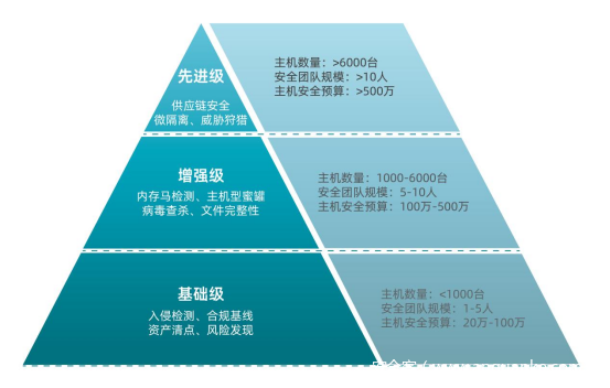 随着攻击手段不断演进,主机安全防护技术也在持续更新迭代,衍生出一系列不同细分类别的主机安全产品,其安全能力按照成熟度以及可匹配的用户需求,可划分为三个级别:基础级、增强级和先进级。
