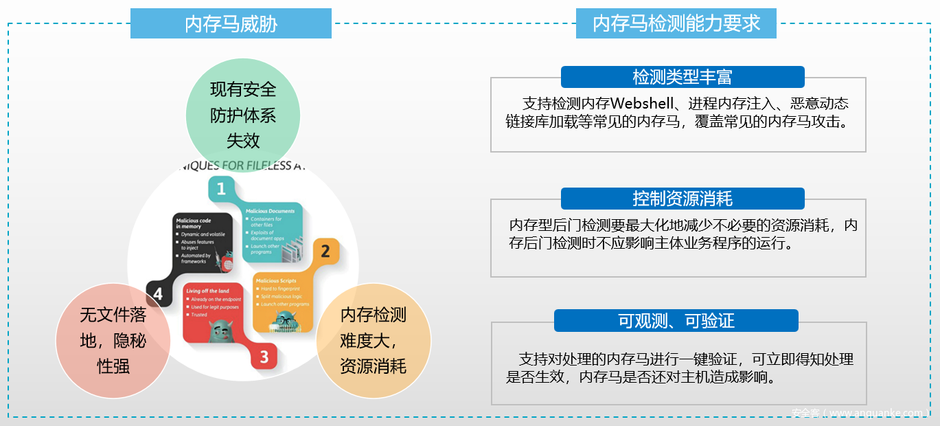 内存马检测:为提升行为隐秘性和绕过应用规则检测的可能性,基于宏和脚本等的无文件攻击能够实现上述目标,成为趋势,而内存马攻击则为无文件攻击的一种常见攻击类型,最常见的两种手段是内存Webshell和内存恶意代码,相应检测能力十分必要。