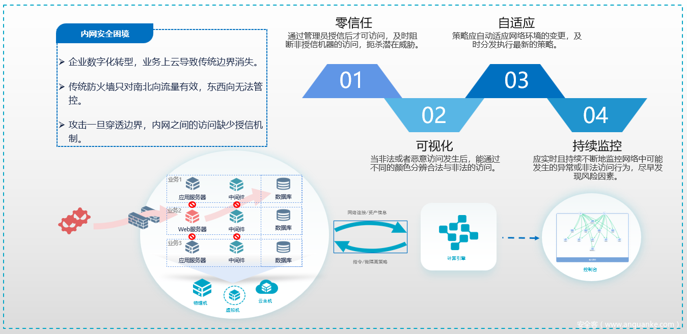微隔离:企业数字化转型,业务上云导致传统边界消失。而传统防火墙只对南北向流量有效,东西向无法管控。攻击一旦穿透边界,内网之间的访问缺少授信机制。微隔离架构能够对东西向流量提供防护,契合行业发展需求。