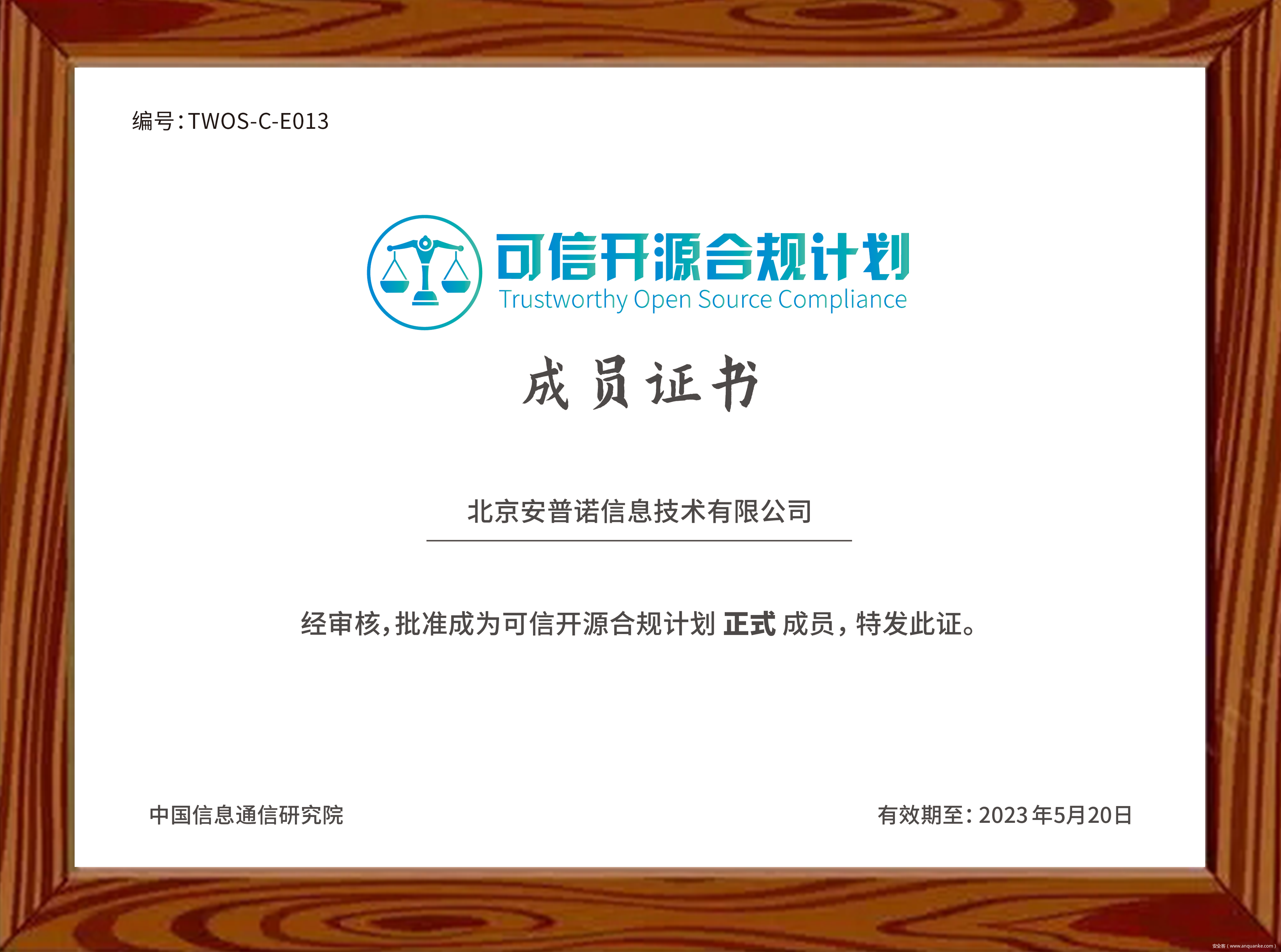 图1 “可信开源合规计划”成员证书