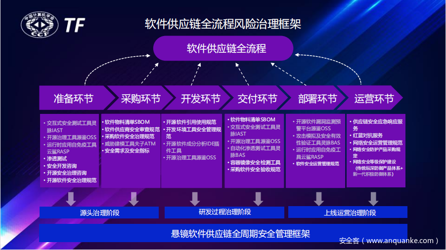 结合整个软件供应链全流程风险治理框架来看,在框架的每个环节都可以通过融入核心的自动化技术和配套的安全服务规范,形成高效的解决方案。
