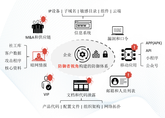 以往从防御者的角度出发而构建的防御体系已不足以提供全面的防护,尤其是在企业快速数字化转型的今天,企业逐渐无法掌控影子资产、IT资产、移动应用风险和邮箱泄露引发的钓鱼风险等。不仅如此,攻击者还会利用泄露的互联网上的文档和代码、高管人员信息、暗网中的社工库、勒索软件、供应链等对企业发起攻击。而外部攻击面管理技术的出现,就是为了帮助企业更好地解决上述问题。