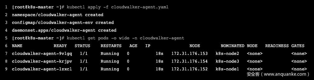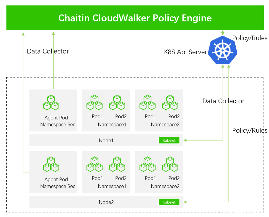 牧云(CloudWalker)研发团队基于DaemonSet特性,将CWPP安全能力云原生化到每一个DaemonSet探针,以平行容器的形态部署于容器平台中,使其始终运行于每一个Node上。在新业务上线和扩容时,运维者无需重新安装Agent,便可敏捷、弹性地获取原生的安全能力,天然适配云原生场景。