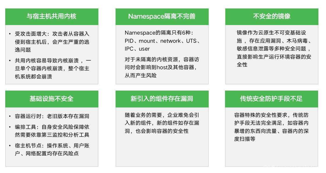 从容器的自身架构和工作机制来看,容器遭受攻击主要有以下6个原因: