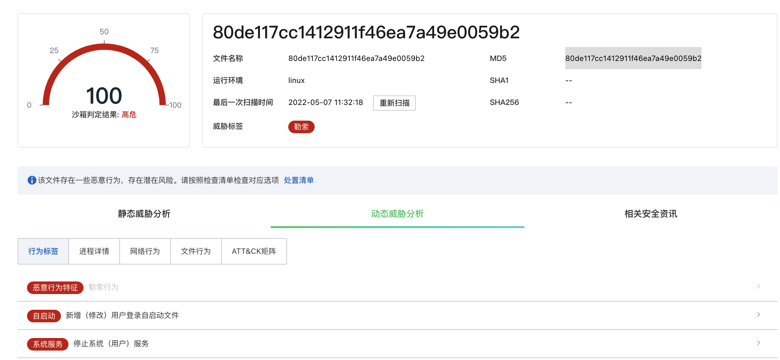 阿里云沙箱基于仿真沙箱环境,能多维度识别勒索病毒:文件加密、修改文件后缀、释放勒索信等