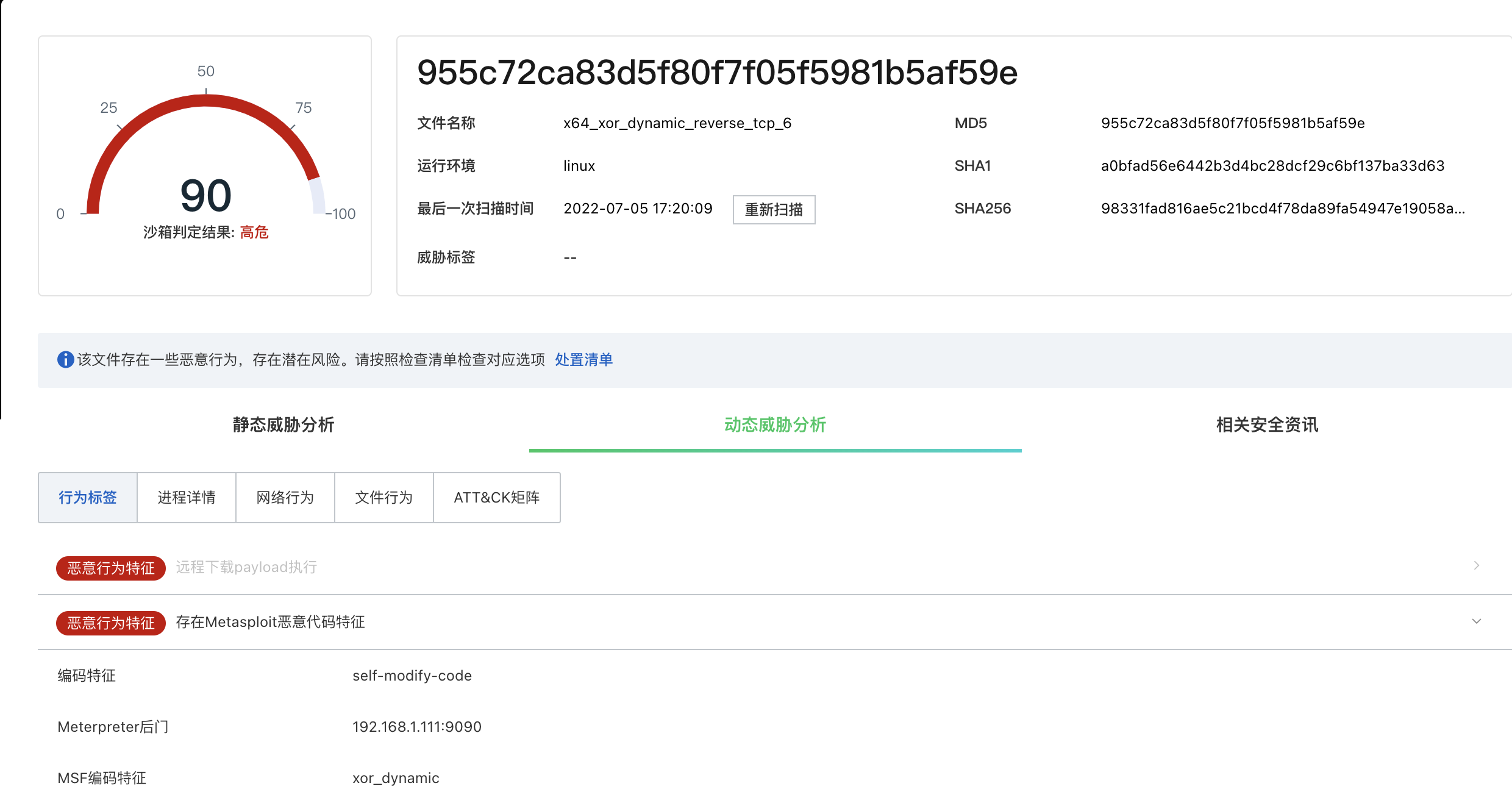 阿里云沙箱针对MSF编码器指令执行序列分析,能够精准识别MSF编码的恶意文件,识别出后门回连地址。