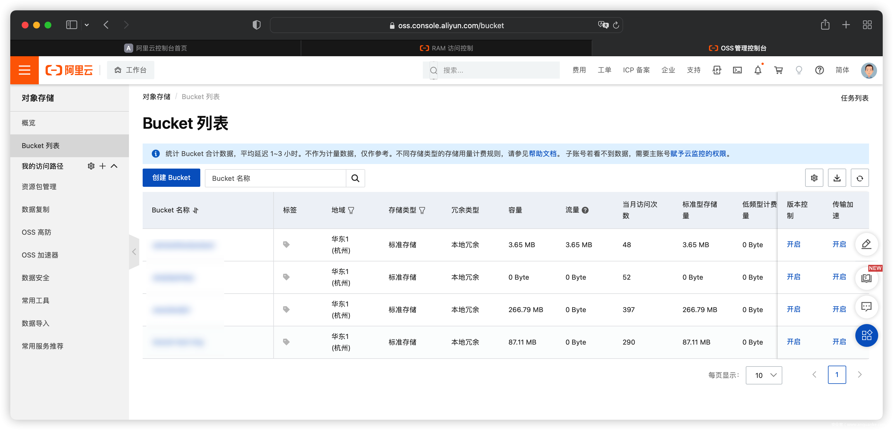 在控制台中看看这个账号下的 OSS 对象存储服务