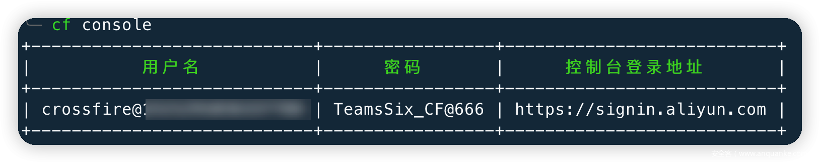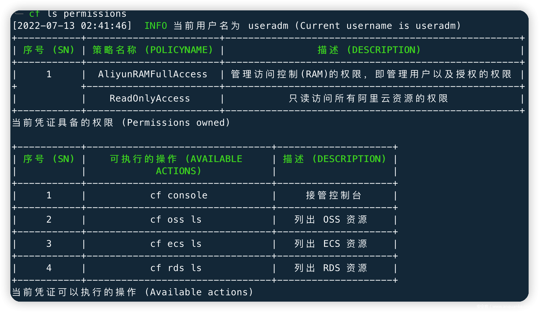 开始之前这里先简单介绍一下这个工具,CF 是这个工具的名字,通过它可以很方便的进行云上内网渗透,比如一键在所有实例上执行命令、一键接管控制台、一键列出云服务资源等等。