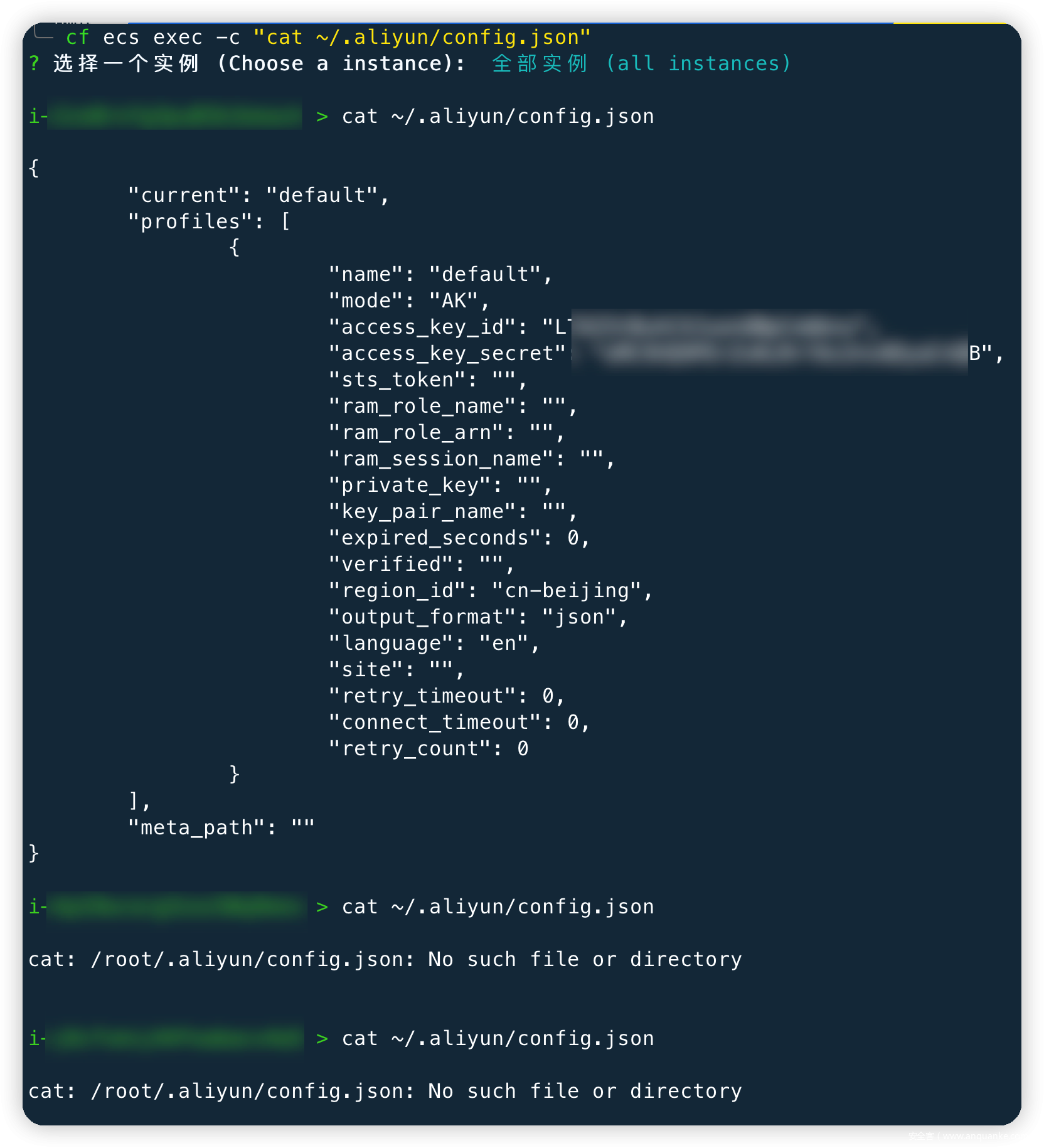cf ecs exec -c "cat ~/.aliyun/config.json"