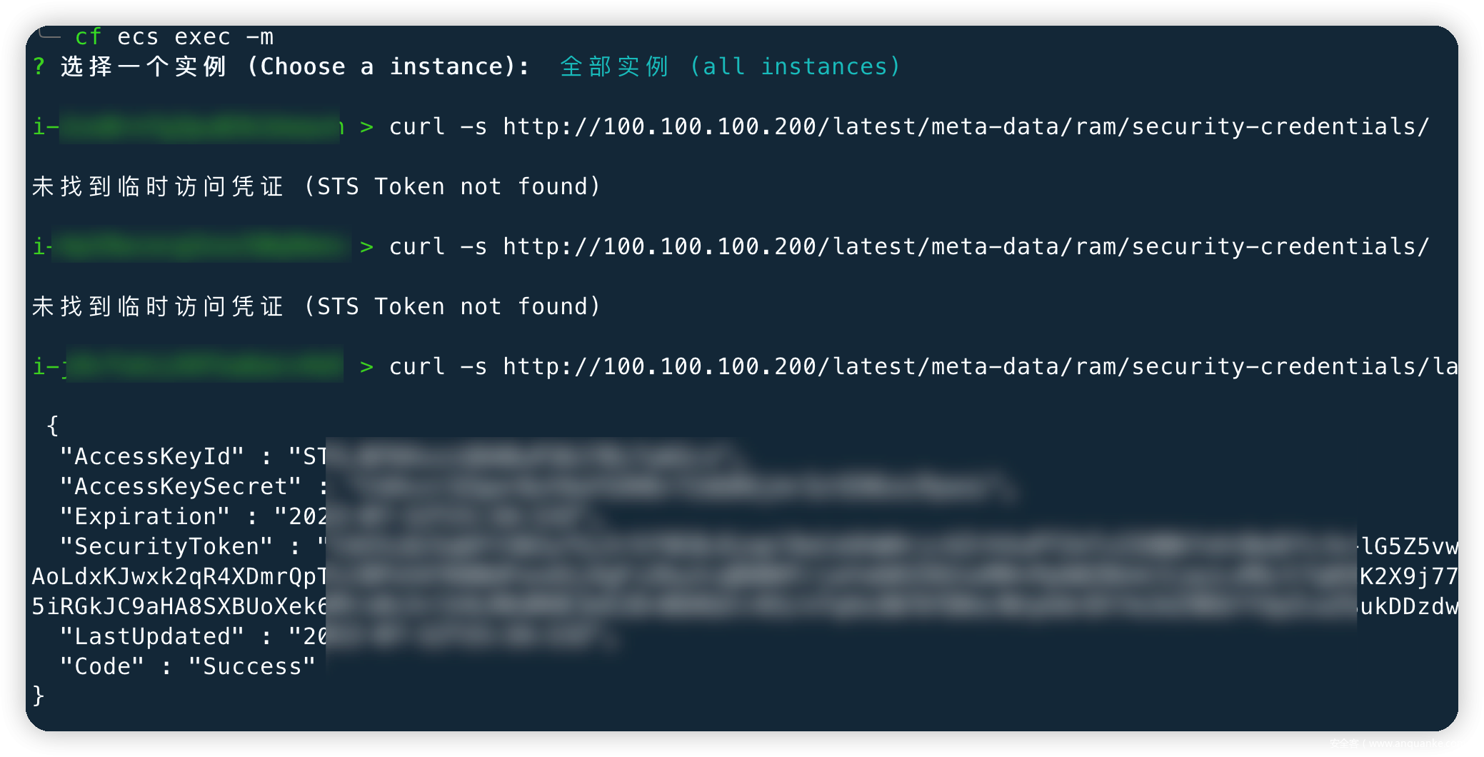 发现只有一个实例可以获取到临时访问凭证,而且这个有临时访问凭证的实例就是上述存在 SSRF 漏洞的那台机器。