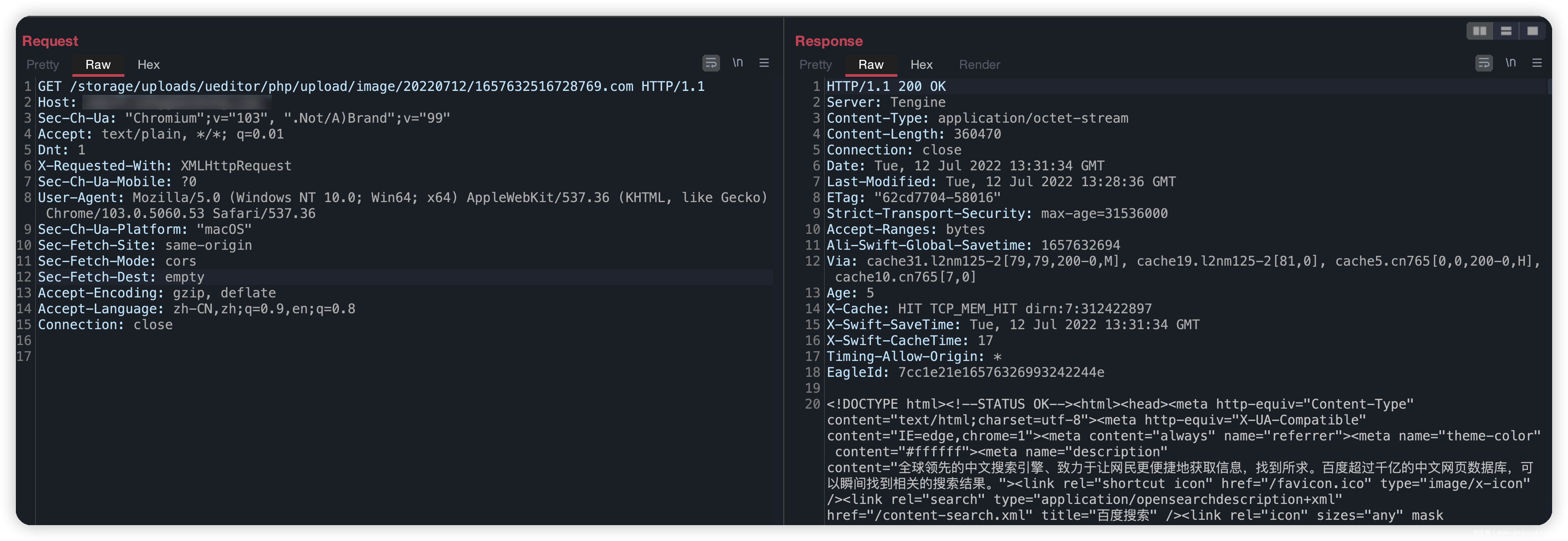 然后我们读取返回的文件地址,通过返回的内容可以看到服务端确实访问到了 https://baidu.com?.jpg,说明这里确实存在 SSRF 漏洞。