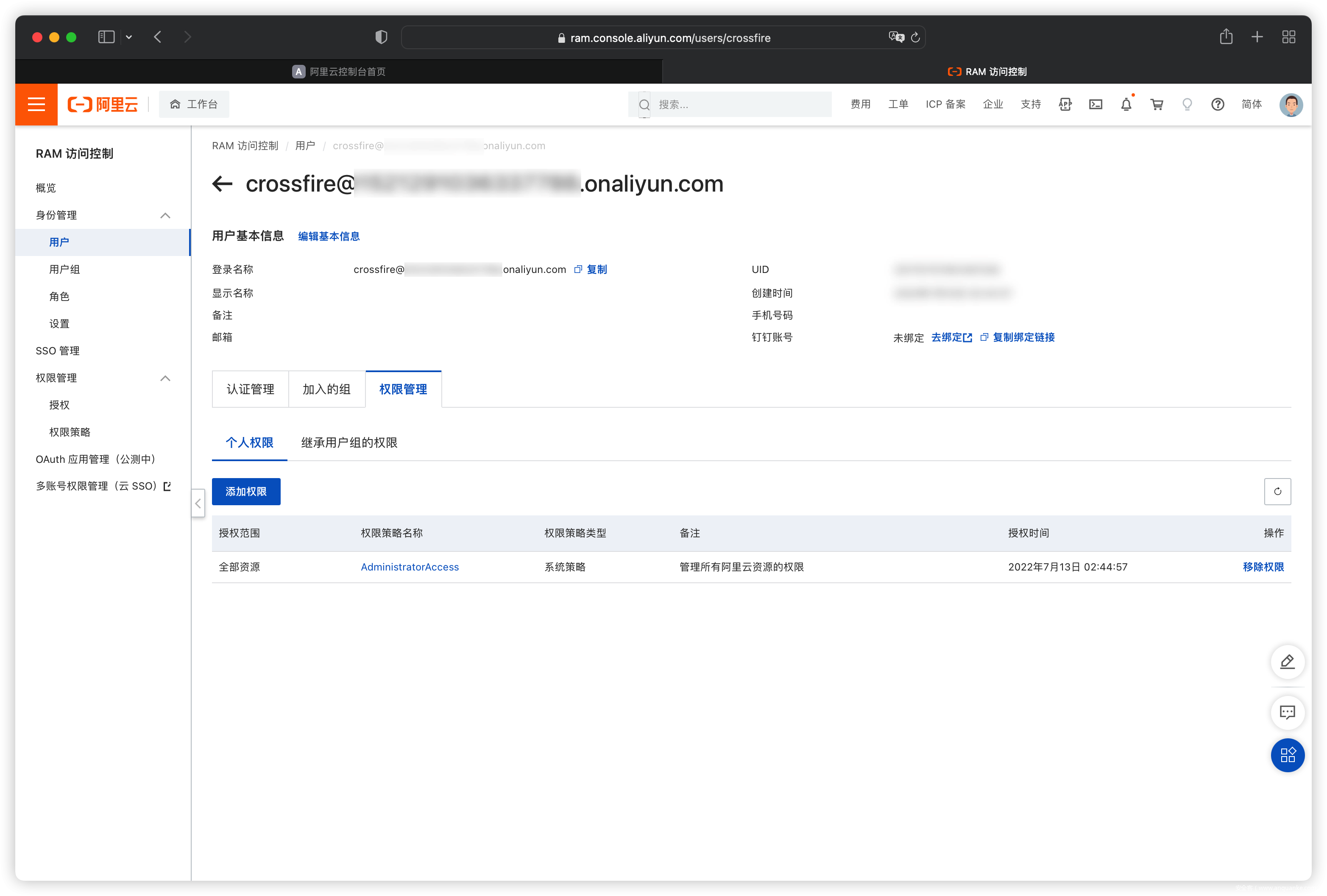 在访问控制里,可以看到当前权限为AdministratorAccess,这也就意味着我们已经拿到了该租户的管理员权限。