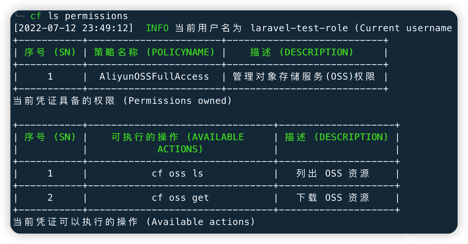 可以看到当前权限具有 OSS 的全部权限,并且可以使用 CF 的「列出 OSS 资源」以及「下载 OSS 资源」的功能。