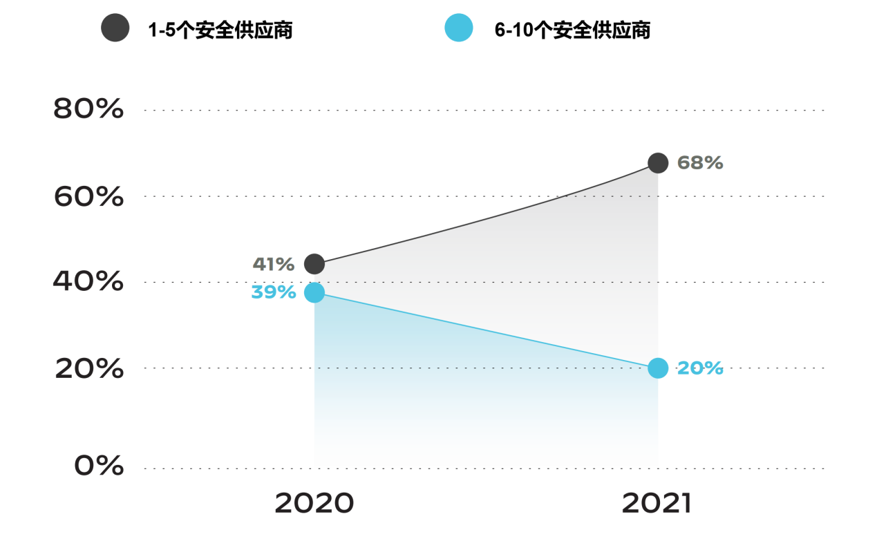 在调研中发现各组织在将应用扩展到云环境时,还整合了他们的云原生安全供应商。如图2所示,2021年使用1到5个安全供应商的组织数量增加了27%,使用6到10个安全供应商的组织数量与2020年相比下降了19%。