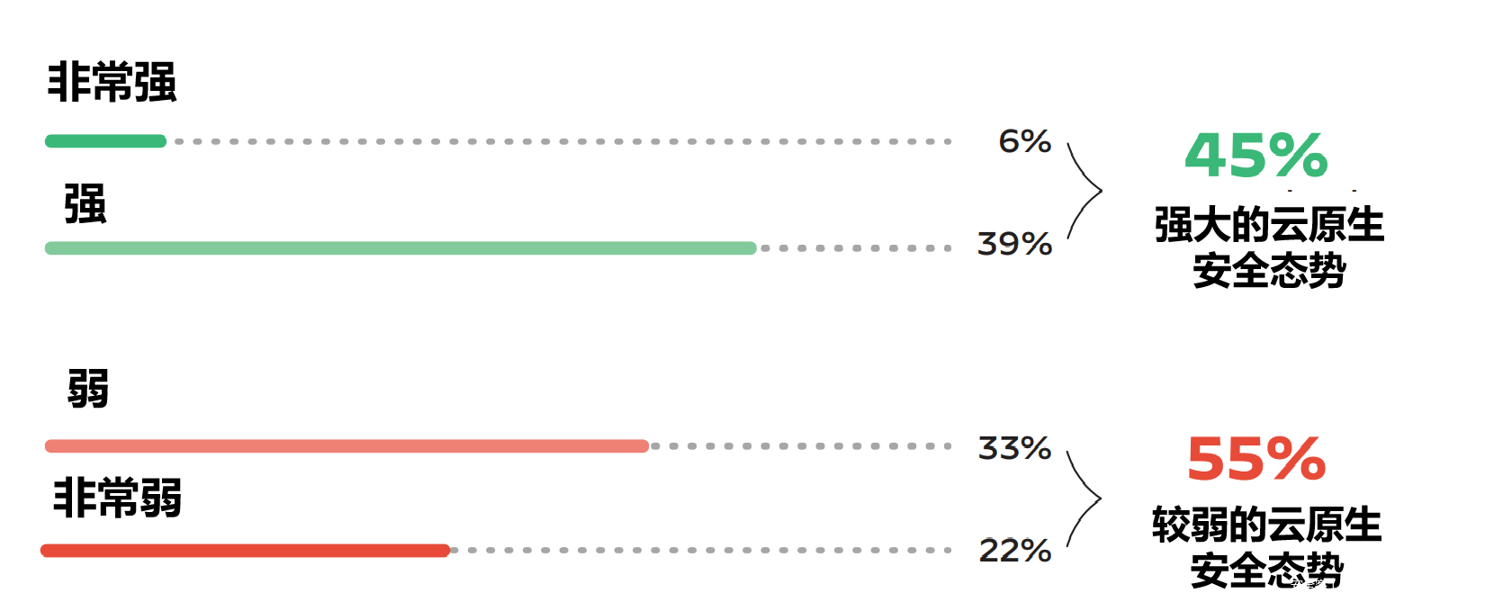 如图3所示,为了衡量云原生安全态势,我们通过6个调查问题,调研了各组织的安全人员,受访者对这些问题的认可度越高,表明该组织的安全工作越有效。如图4所示,调查发现55%的组织安全能力较弱,比如在获得多云可见性、跨应用的统一安全管理或者简化事件响应流程等方面需要优化。