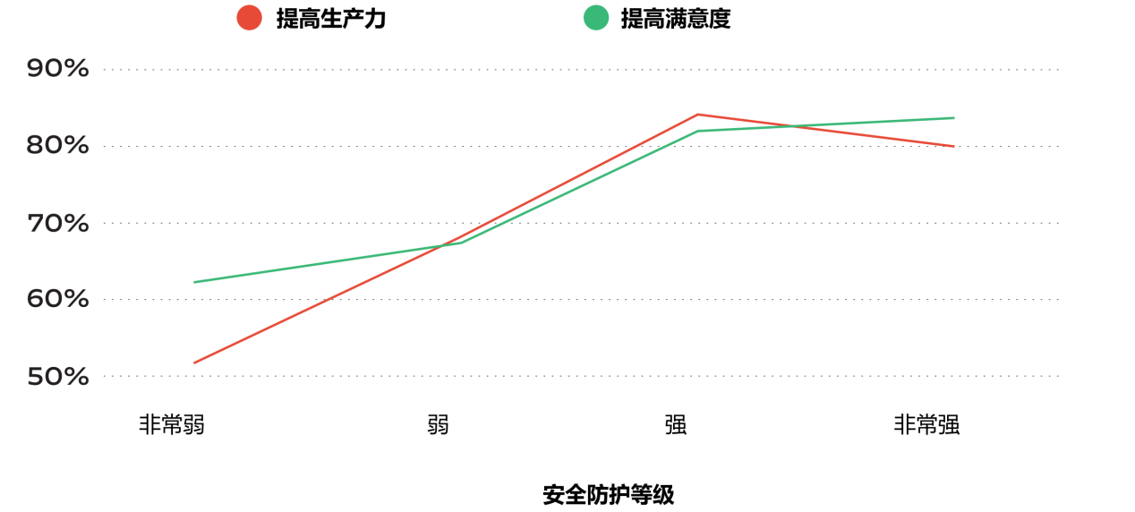 强大的安全能力,不但可以提高运营效率,而且具有高安全态势和低摩擦的组织可以提高生产力和员工满意度。如图7所示,调研发现超过80%的安全摩擦水平较低的组织报告员工满意度显著提高。