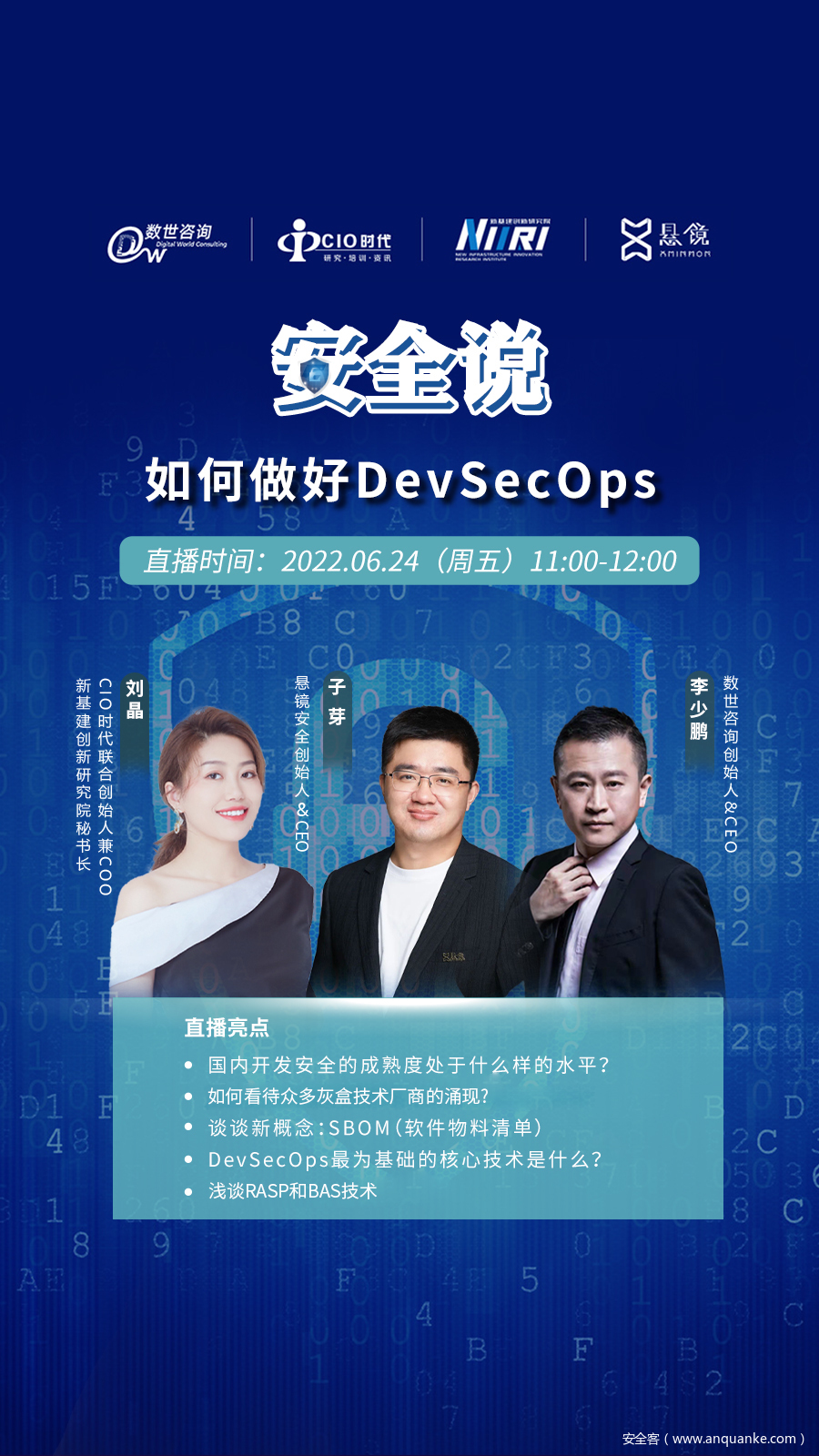 近期,悬镜安全创始人&CEO子芽应“第二届数字安全大会”特别邀请,做客由数世咨询、CIO时代以及新基建创新研究院联手打造的全线对话访谈节目《安全说》直播间,与数世咨询创始人&CEO李少鹏和CIO时代联合创始人&COO刘晶,就DevSecOps的现状、发展以及关键技术演进进行了深度交流和探讨。