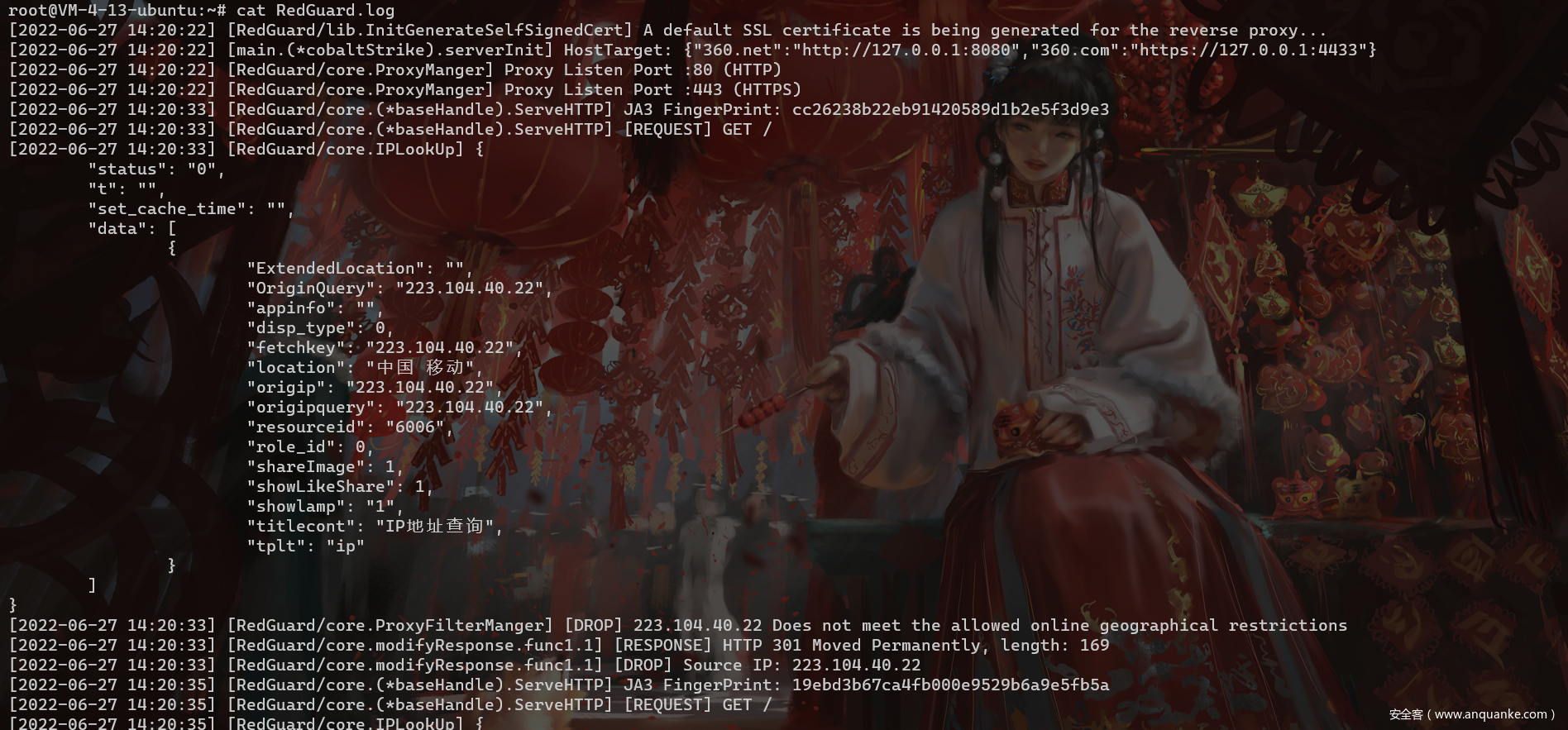 关于地域限制的上线,在目前的攻防演练可能比较实用,基本上省市级的护网限制的目标都是在指定区域中,而对于其他地域请求的流量自然可以忽略不计,而RedGuard这一功能不仅仅可以限制单一地域也可以根据省、市限制多个上线地域,而对其他地域请求的流量进行拦截。