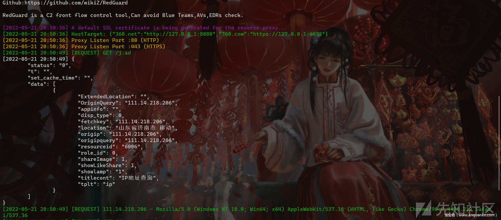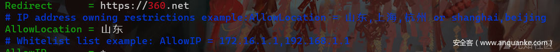 配置方式以AllowLocation = 济南,北京 为例,这里值得注意的是,RedGuard提供了两个IP归属地反查的API,一个适用于国内用户,另一个适用于海外用户,并且可以根据输入的地域名动态的分配使用哪个API,如果目标是中国的那么设置的地域就输入中文,反之输入英文地名,建议国内的用户使用中文名即可,这样反查到的归属地准确度以及API的响应速度都是最好的选择。