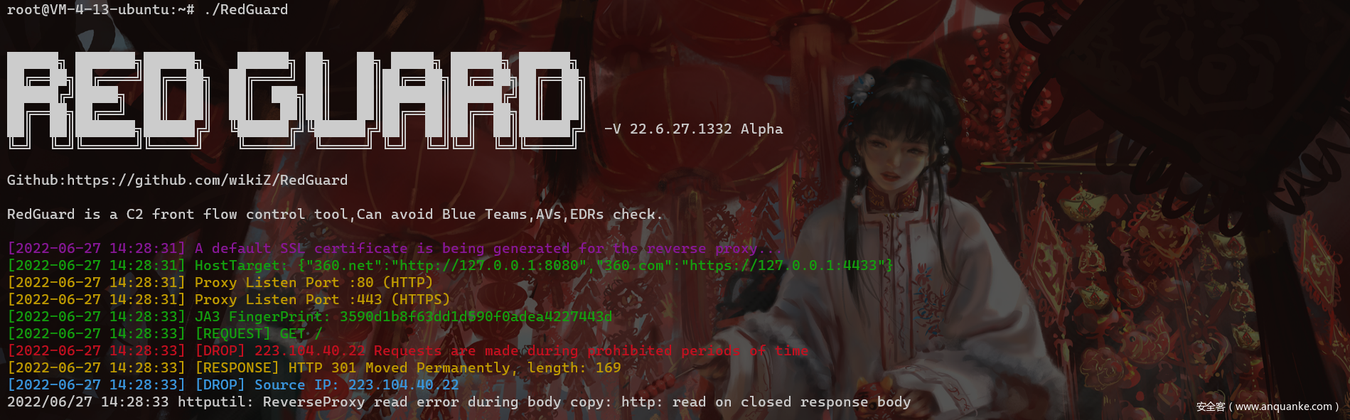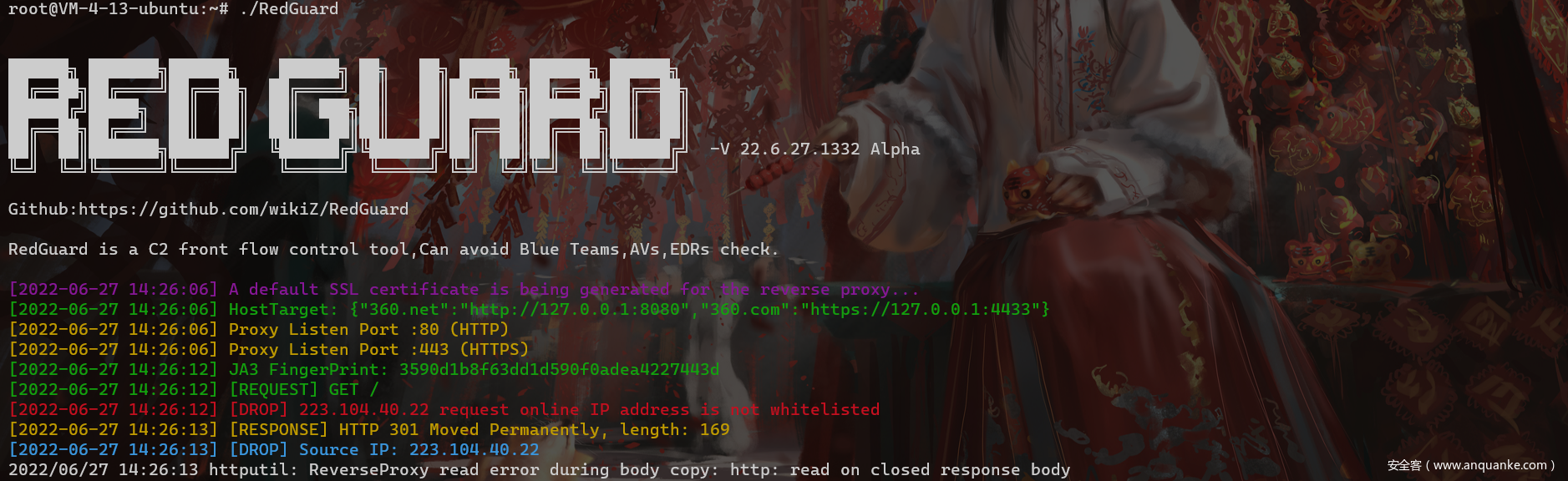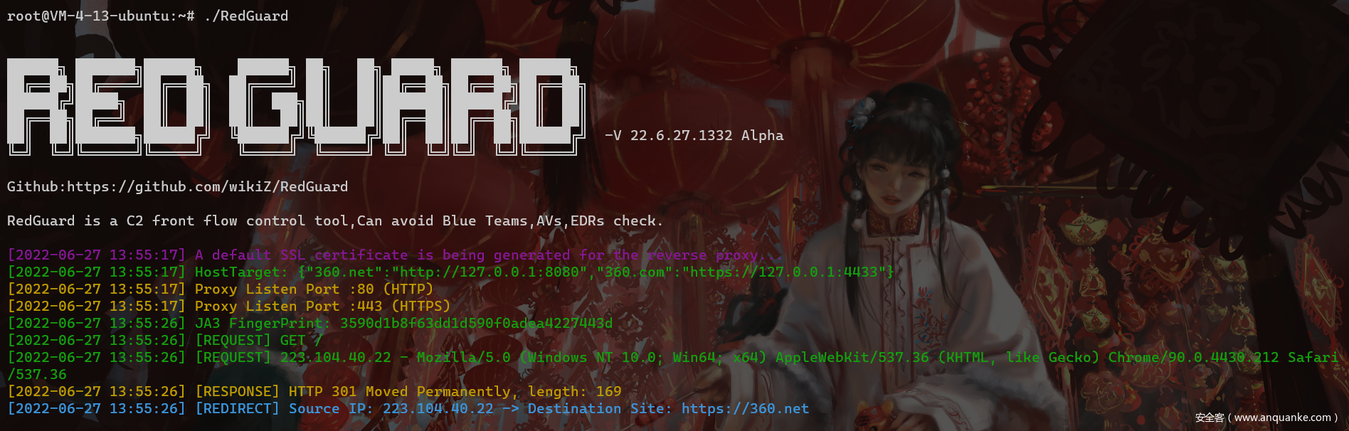 这里为了方便展示输出效果,实际使用可以通过nohup ./RedGuard &后台运行。