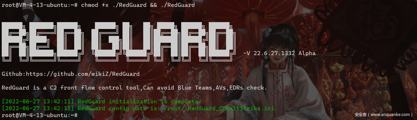 如下图,首先对RedGuard赋予可执行权限并进行初始化操作,第一次运行会在当前用户目录下生成配置文件,以实现灵活的功能配置,配置文件名:.RedGuard_CobaltStrike.ini。