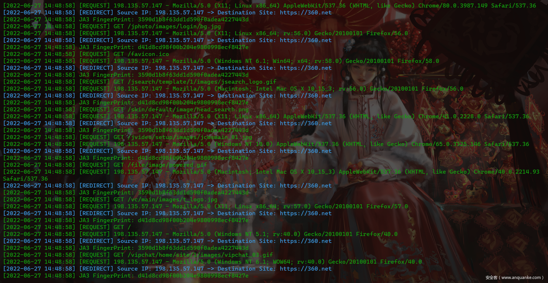 下图所示的流量也就是当拦截规则设置为Redirect时,我们会发现当测绘探针收到响应后会继续对我们进行目录扫描,UserAgent为随机,看起来符合正常流量的请求,但是也都成功被拦截了。
