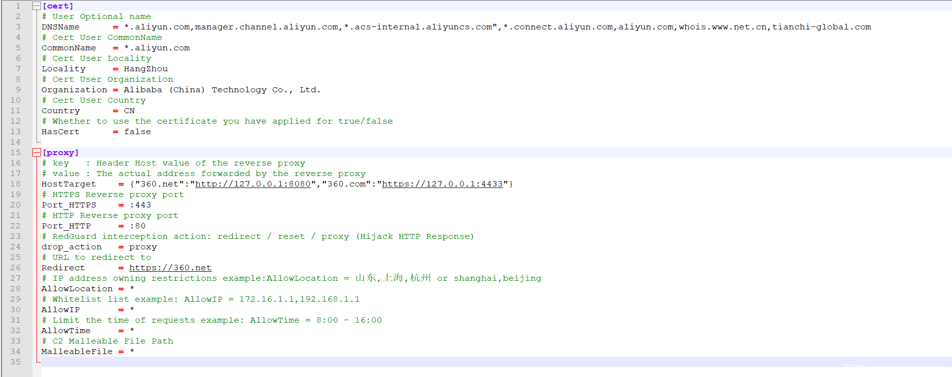 cert的配置选项主要是针对样本与C2前置设施的HTTPS流量交互证书的配置信息,proxy主要用于配置反向代理流量中的控制选项,具体使用会在下面进行详细讲解。