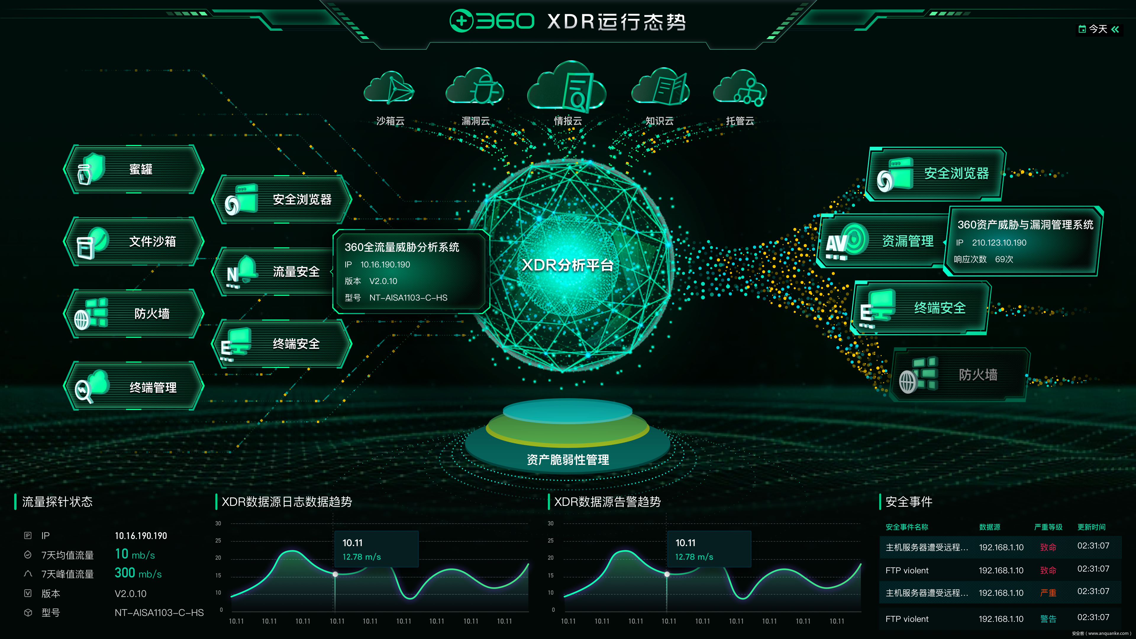 360全网数字安全大脑汇集了300亿+恶意样本、22万亿安全日志,全球90亿域名信息、2EB以上大数据,通过情报云、知识云、漏洞云、测绘云、专家云、沙箱云、查杀云等开放安全云服务将安全可见能力赋能本地安全大脑,结合XDR完善的原生神经元体系,在N世界的云原生环境中构建安全数据采集能力进行监测和响应,发现了很多传统检测手段难以看见的威胁,对N世界进行全方位的威胁感知。