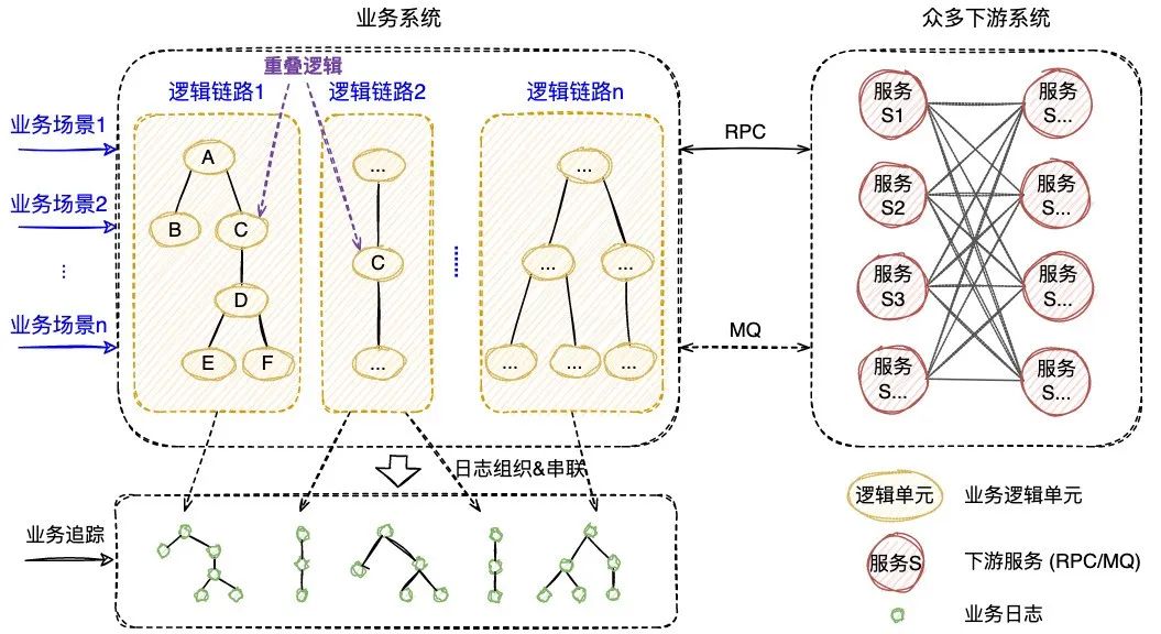 日志筛选困难:不同业务场景、业务逻辑之间存在重叠,重叠逻辑打印的业务日志可能相互干扰,难以从中筛选出正确的关联日志。