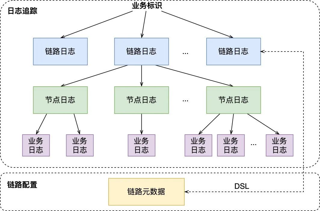 业务日志。其中节点日志的作用是绘制链路中的已执行节点,记录了节点的开始、结束、输入、输出;业务日志的作用是展示链路节点具体业务逻辑的执行情况,记录了任何对业务逻辑起到解释作用的数据,包括与上下游交互的入参出参、复杂逻辑的中间变量、逻辑执行抛出的异常。
